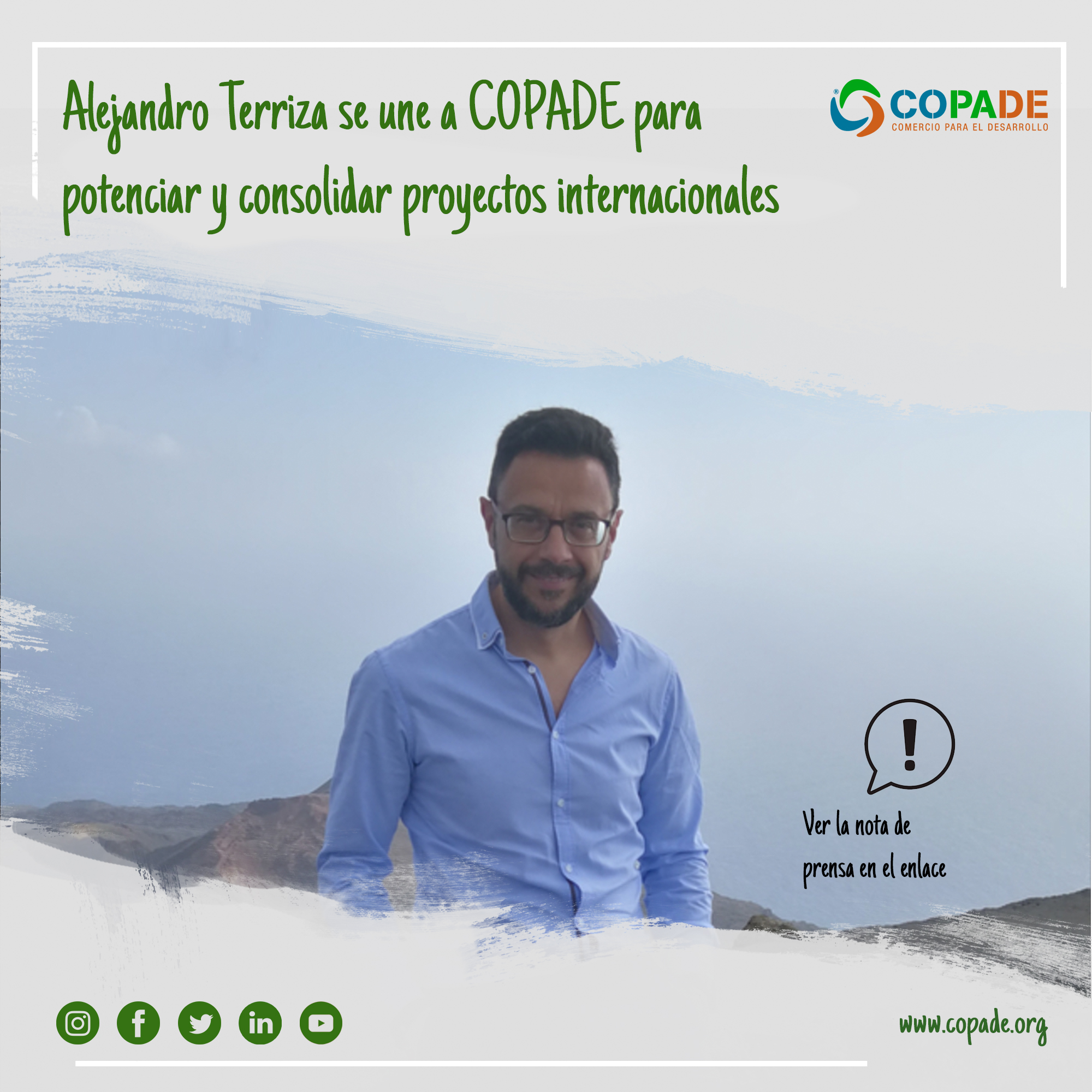 Madrid, 11 de agosto de 2021 – Fundación Copade ha incorporado a Alejandro Terriza a su equipo directivo para liderar, potenciar y consolidar proyectos de ámbito internacional. Como Director Adjunto se encargará de reforzar la estructura y la dirección de la Fundación apoyando a la actual dirección a seguir liderando el Comercio para el Desarrollo.