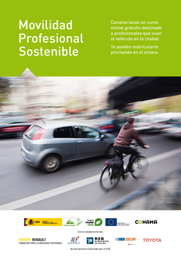 En el contexto de las políticas de cambio climático y de calidad atmosférica, las administraciones locales están desarrollando medidas sobre la movilidad que están cambiando de forma sustancial la forma de moverse en las ciudades. En particular, esto afecta a los profesionales que se dedican a la labor comercial dedicados al transporte de las mercancías urbanas, entre otros. Por esto, Fundación Conama ha puesto en marcha el proyecto Movilidad Profesional Sostenible con esta formación gratuita que se enmarca en el Programa Empleaverde 2017, iniciativa de la Fundación Biodiversidad, del Ministerio de Agricultura y Pesca, Alimentación y Medio Ambiente y cofinanciado por el Fondo Social Europeo.