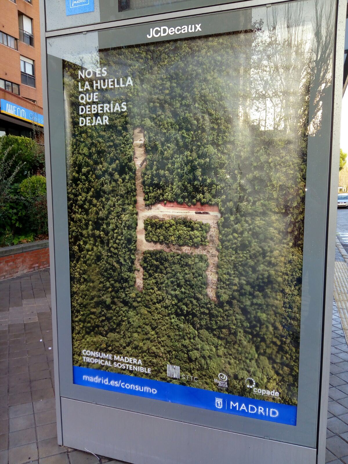Estas navidades, la Oficina de Consumo del Ayuntamiento de Madrid lanzó con la colaboración de COPADE una nueva campaña de sensibilización ciudadana llamada ‘No es la huella que deberías dejar’. La campaña, que estuvo en 98 paradas de autobús de la EMT de la ciudad de Madrid entre el 25 y el 31 de diciembre, tuvo como objetivo sensibilizar y promover entre la ciudadanía madrileña el consumo de madera sostenible.