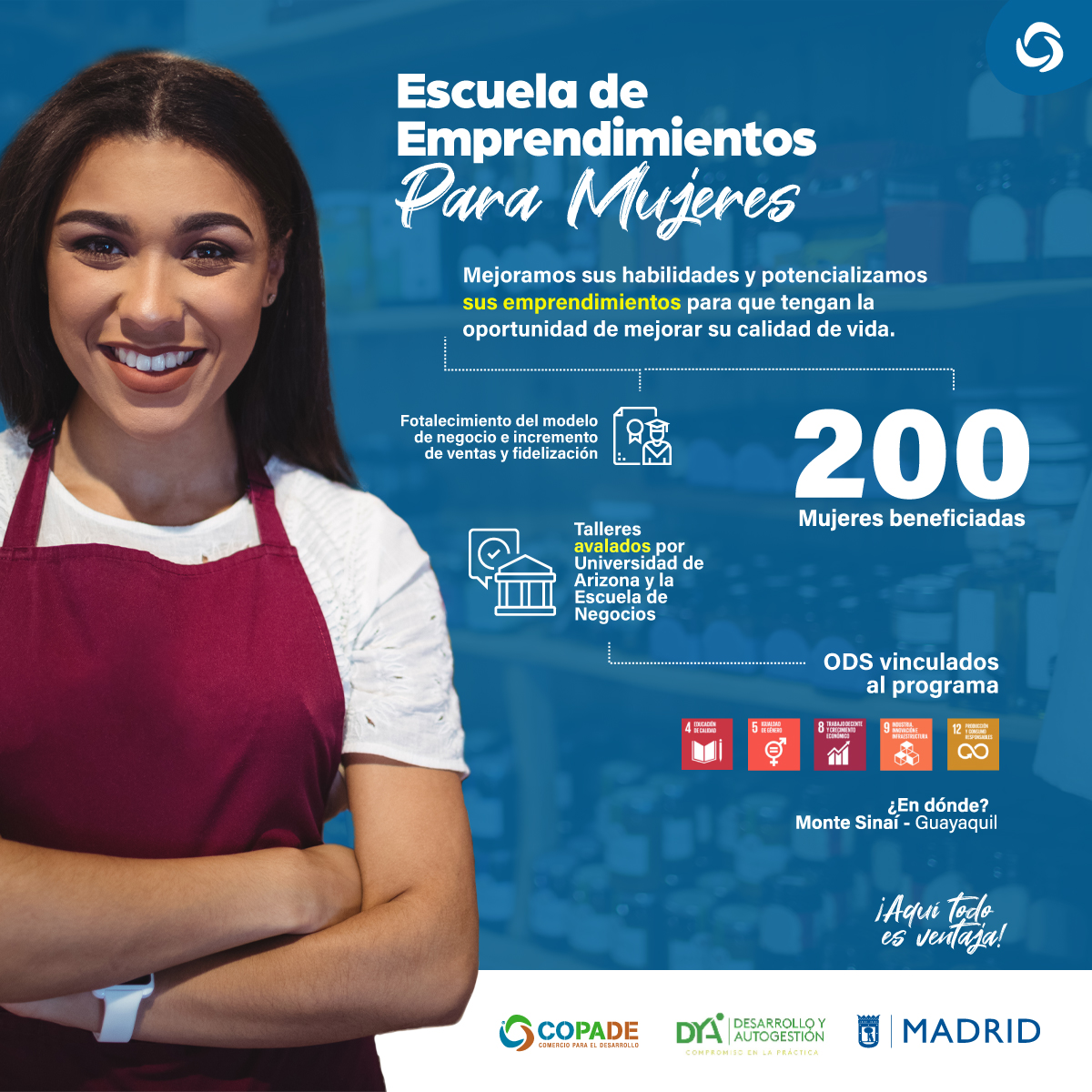 Por estas razones, desde Fundación COPADE en Ecuador y con el apoyo financiero del Ayuntamiento de Madrid, puso en marcha un proyecto direccionado a desarrollar resiliencia económica con enfoque de género para 1.360 mujeres y jóvenes de sectores vulnerables de Guayaquil con capacidades fortalecidas hacia la generación de emprendimientos y empleabilidad.